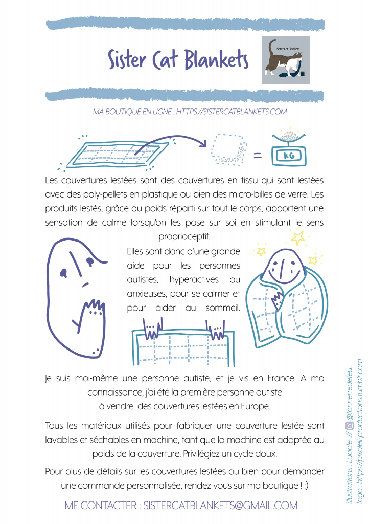 SisterCatBlankets est né en 2016, environ 6 mois après mon propre diagnostic de TSA. Après avoir discuté avec plusieurs personnes autistes via les réseaux sociaux, j’ai constaté qu’il était toujours impossible de commander une couverture lestée en Europe pour un prix raisonnable. J’ai donc pris exemple sur AutisticRabbit, qui fabriquait des couvertures lestées aux Etats-Unis pour aider d’autres personnes autistes et neurodivergentes ; et j’ai créé SisterCatBlankets.
