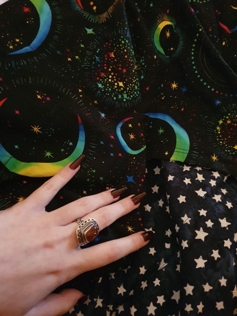 Tissu: noir avec des étoiles arc-en-ciel d’un côté et bleu foncé avec des petites étoiles de l’autre